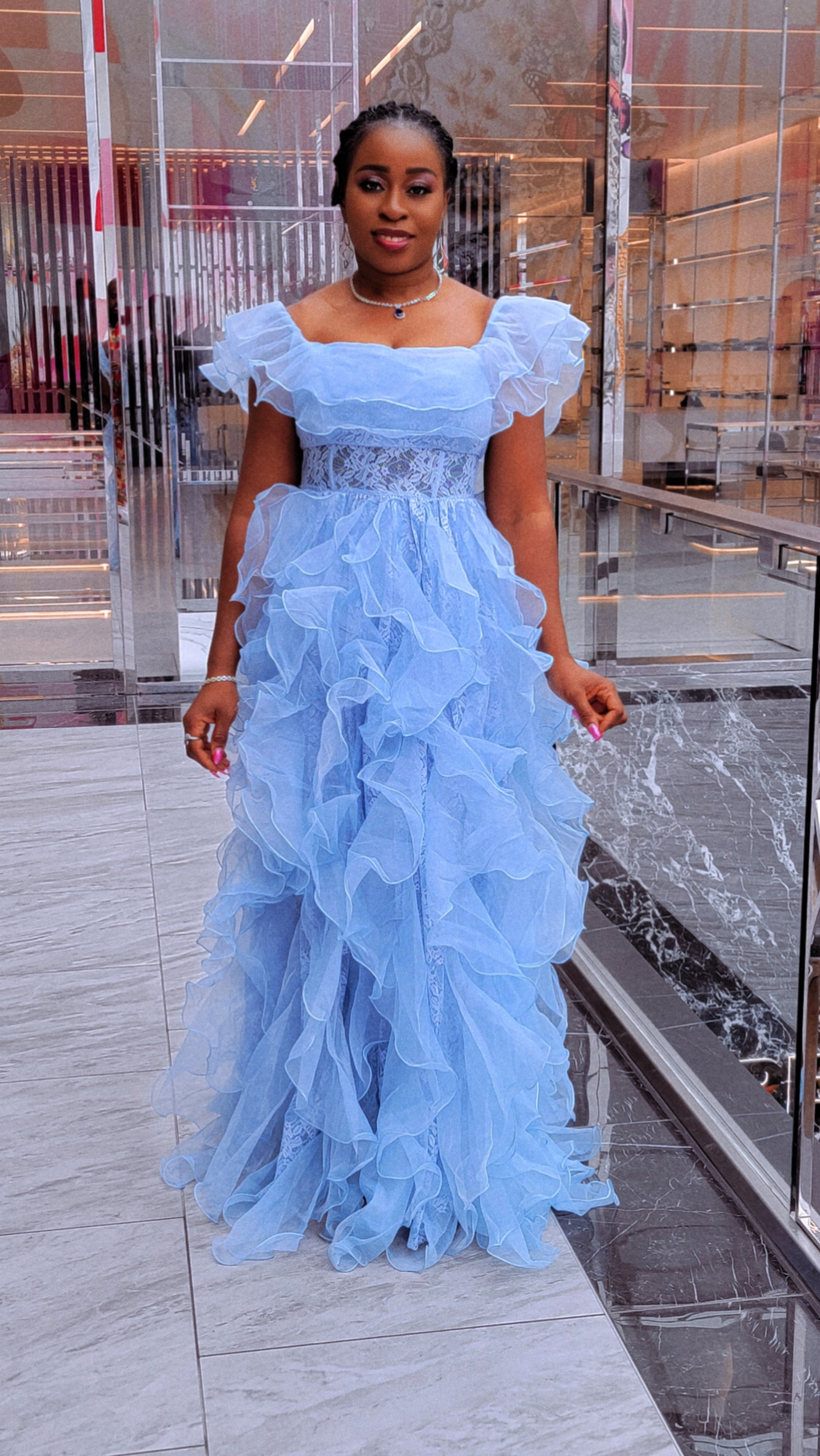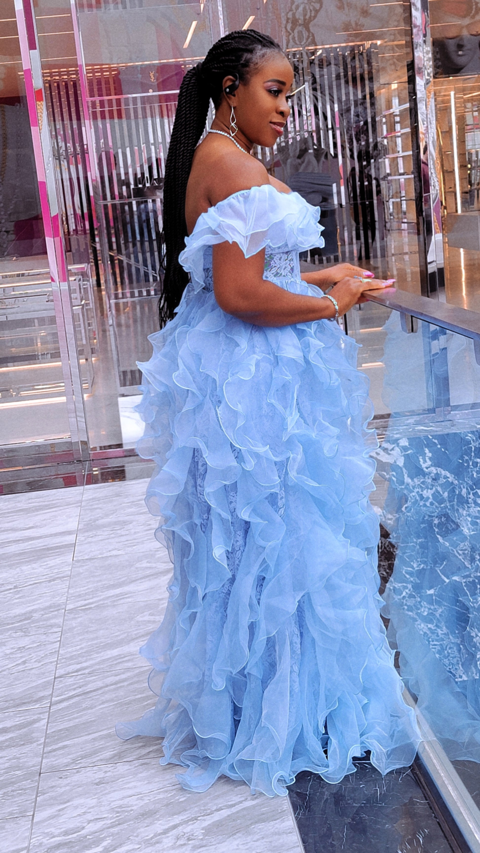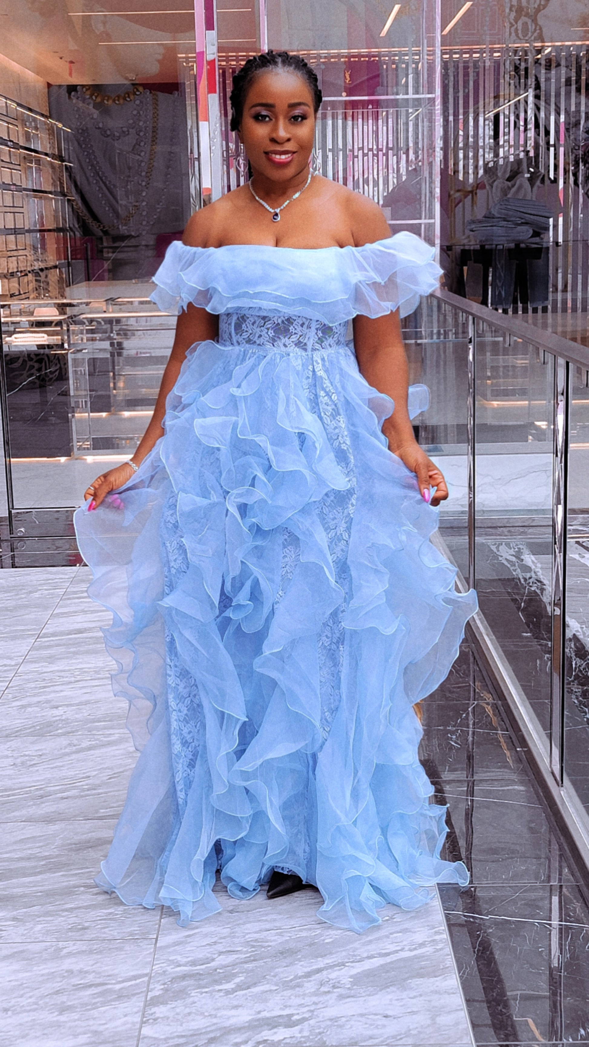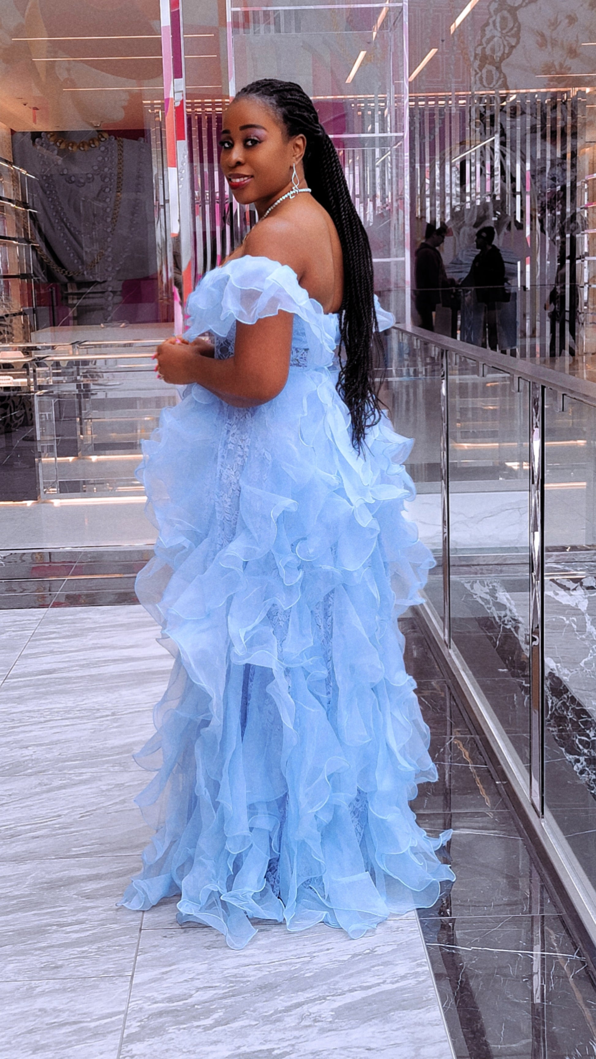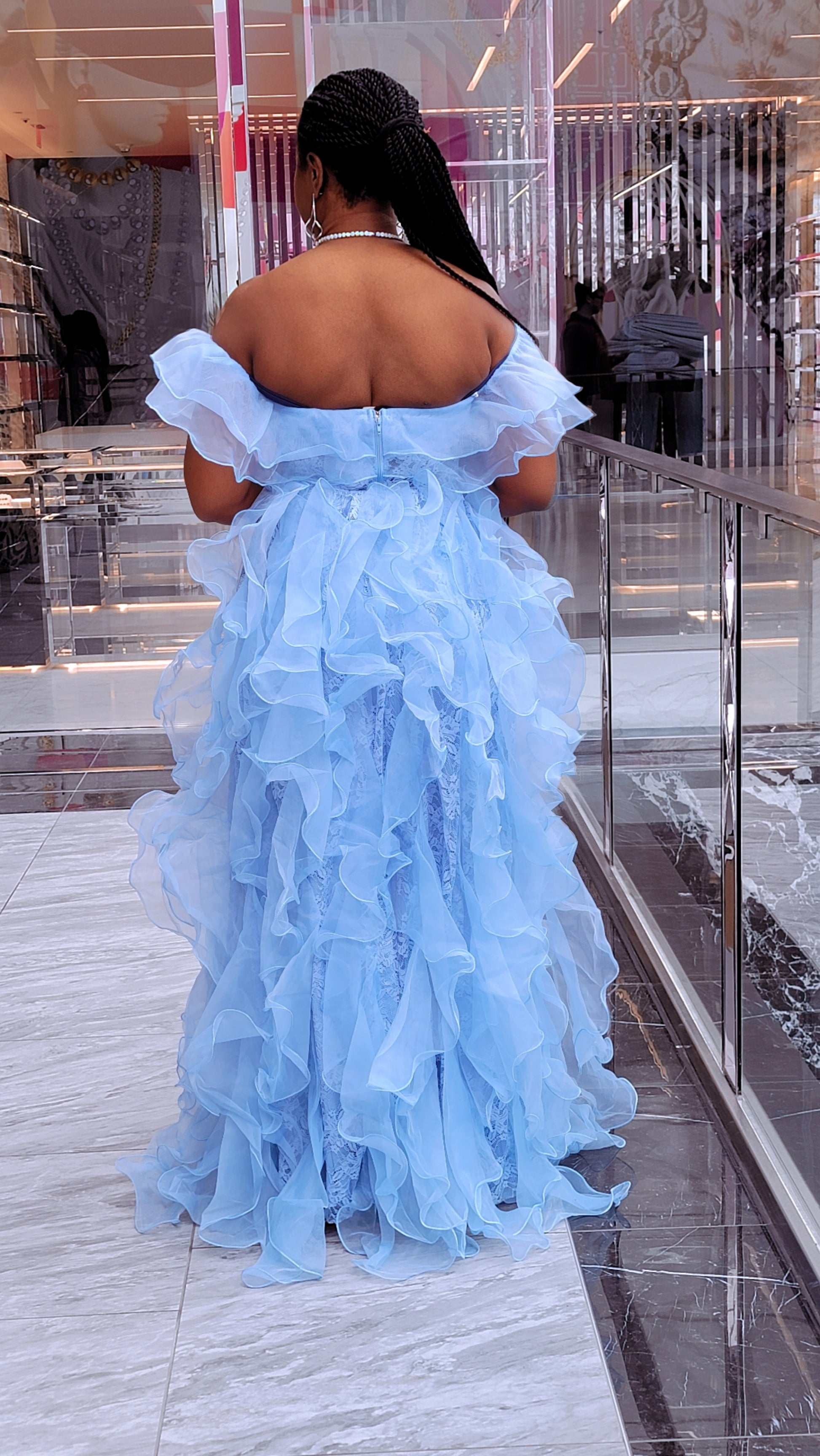 Make a breathtaking entrance in this dreamy sky blue statement gown. Designed with a romantic off-the-shoulder neckline, this dress features soft layered ruffles that cascade effortlessly from bodice to hem for dramatic, feminine movement.